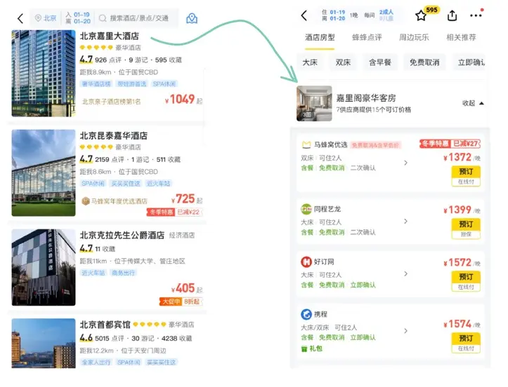 下图为马蜂窝对不同供应商的酒店进行聚合后的展示,不同供应商的报价一目了然,用户进行消费决策更加高效、便捷。