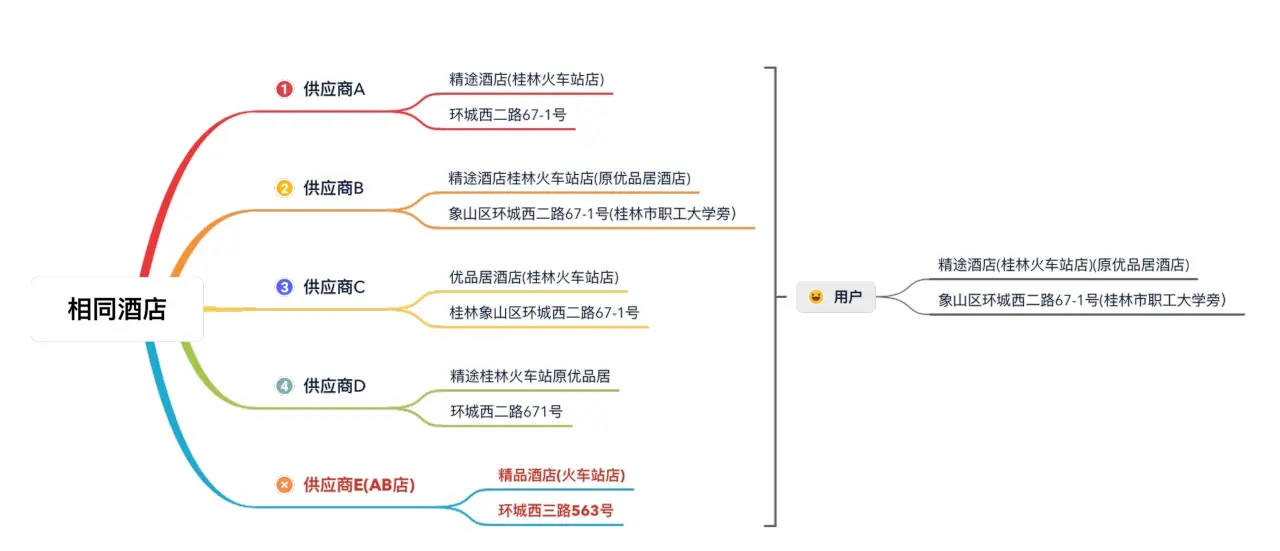 在上图中,用户在 App 中希望打开的是「精途酒店」,但系统可能为用户订到了供应商 E 提供的「精品酒店」,对于这类聚合错误的酒店我们称之为 「AB 店」。可以想象,当到店后却发现没有订单,这无疑会给用户体验造成灾难性的影响。