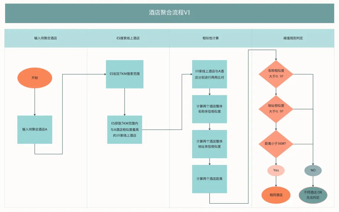 「酒店聚合流程 V1」上线后,我们验证了这个方案是可行的。它最大的优点就是简单,技术实现、维护成本很低,同时机器也能自动处理部分酒店聚合任务,相比完全人工处理更加高效及时。