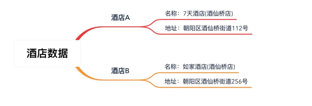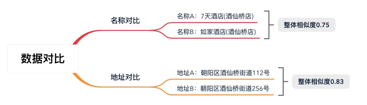 通常情况下,有了名称、地址、坐标这些信息,我们就能对一家酒店进行唯一确定。当然,最容易想到的技术方案就是通过比对两家酒店的名称、地址、距离来判断是否相同。