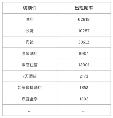 上表中示意的是出现频率较高的词,得到这些词后再经过人工简单筛查,很快就能构建出酒店品牌、酒店类型的分词词典。