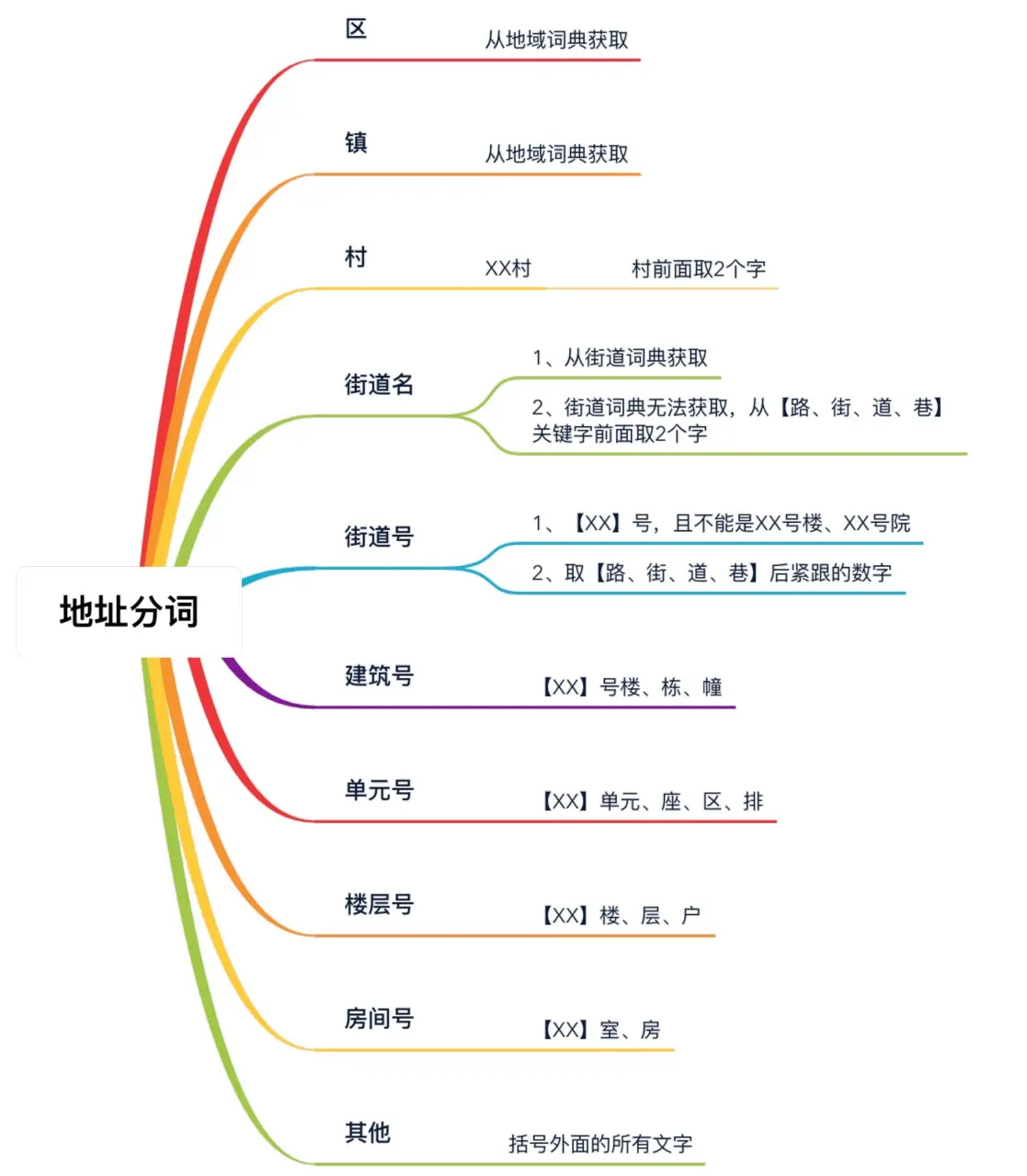 同样,模拟人的思维进行地址分词,使之地址的比对粒度更细更具体。具体分词方式见下图: