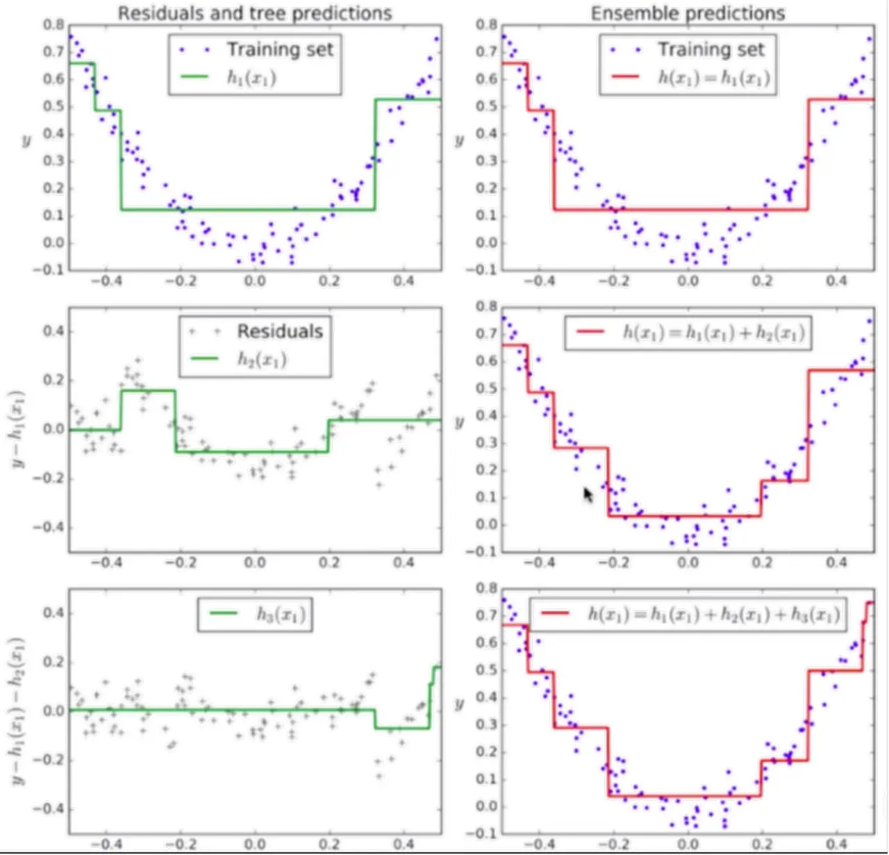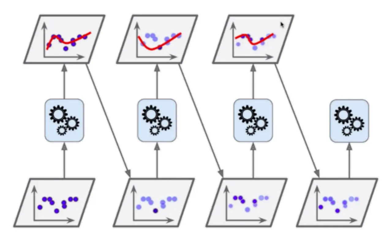 Gradient Boosting 则是通过对前一个模型产生的错误由后一个模型去拟合,对于后一个模型产生的错误再由后面一个模型去拟合…然后依次叠加这些模型: