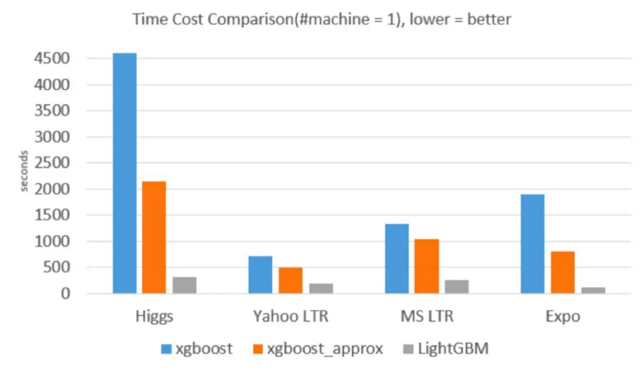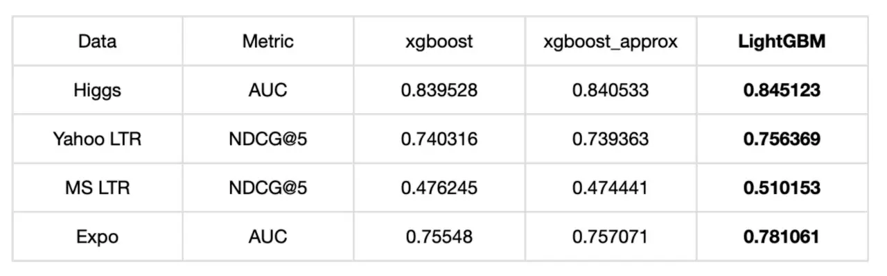 我们分别从内存占用、准确率、训练耗时方面进行了对比,LightGBM 内存占用降低了很多,准确率方面两者基本一致,但训练耗时却也降低了很多。