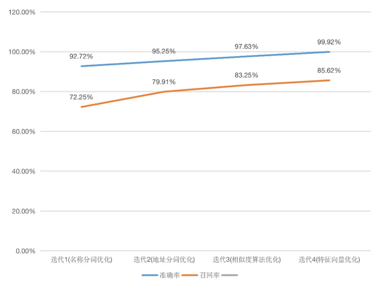 对方案效果的评估通常是凭借「准确率」与「召回率」两个指标。但酒店聚合业务场景下,需要首先保证绝对高的准确率(聚合错误产生 AB 店影响用户入住),然后才是较高的召回率。
