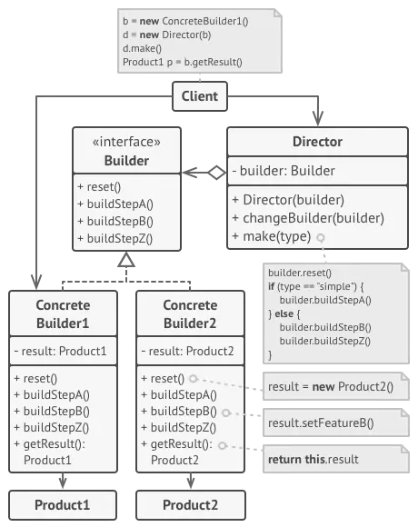 我们可以进一步的将一系列对建造者步骤的调用提取到一个类中,这个类被称为Director。 Director类只定义了执行构建步骤的顺序,而构建器提供了这些步骤的实现。
