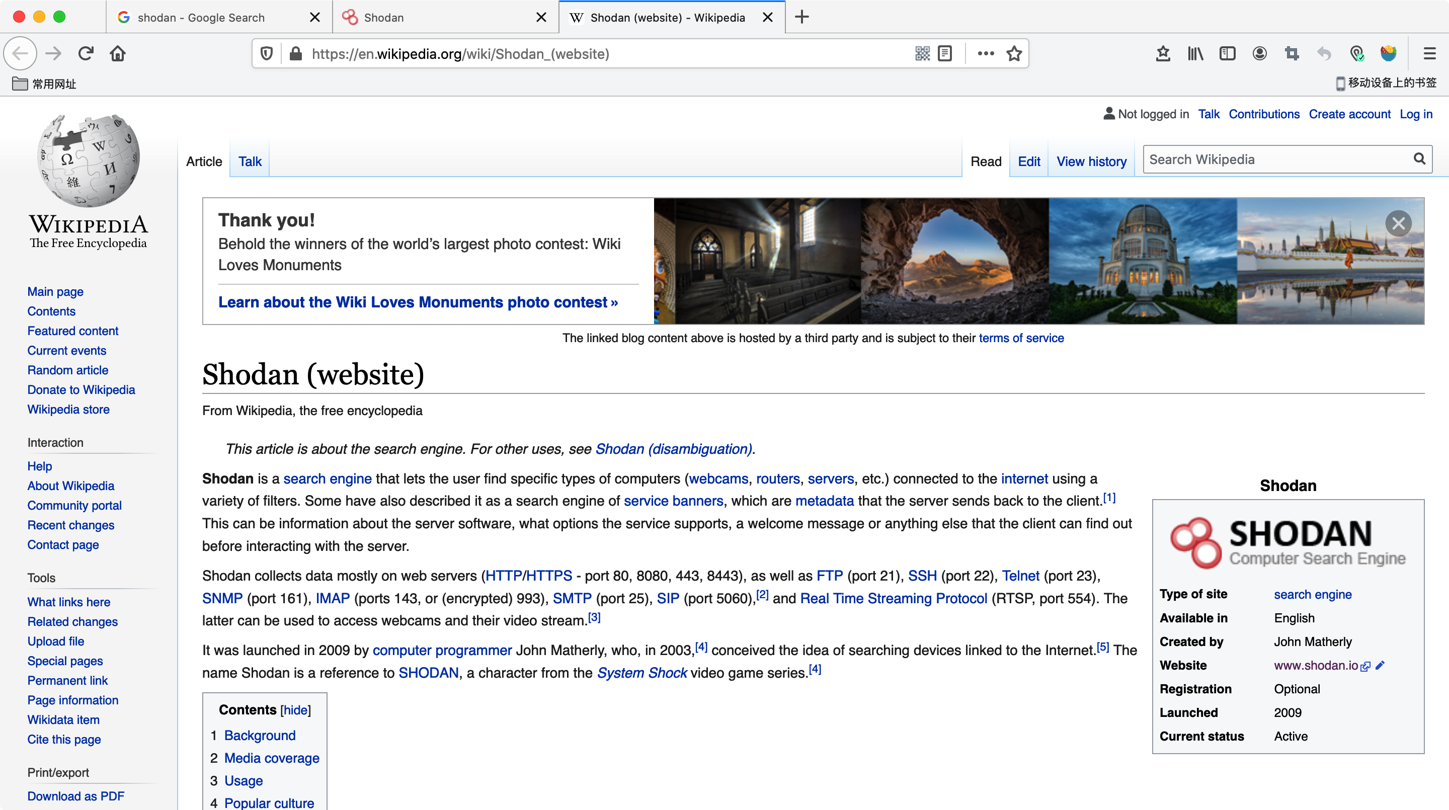 今天看了一篇文章里面提到了作者作为白帽子拔刀相助的英雄事迹,其中他用到了一个强大的搜索引擎——shodan。作为看完必须实践的我首先查询了下shodan,得到以下结果,其中其主要说明了其作为一个特殊的搜索引擎主要搜索网络摄像头、路由器、服务器等