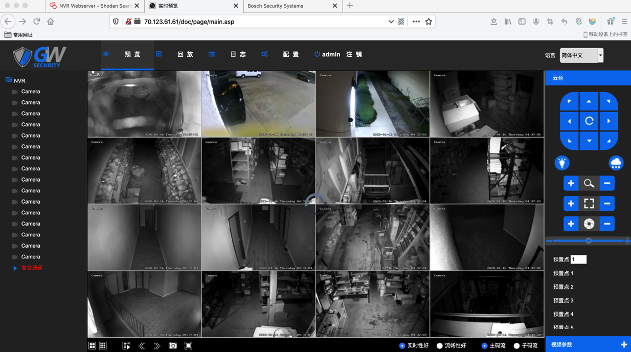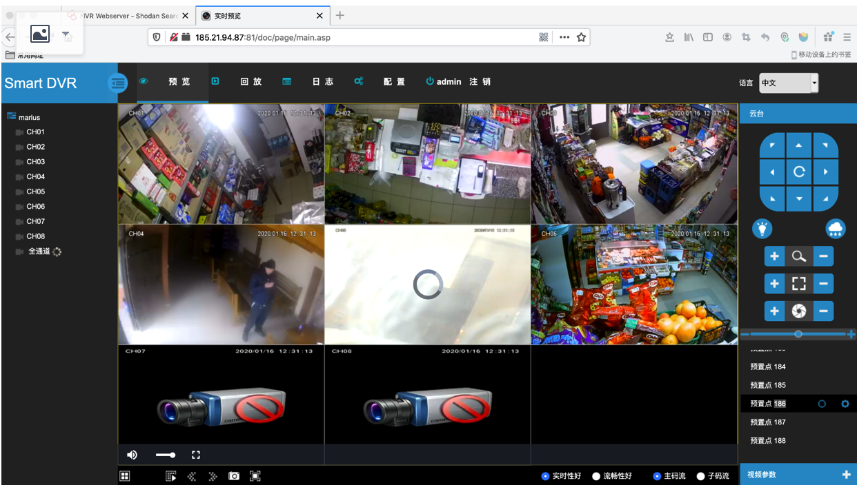 既然能够搜索网络摄像头这也给很多不法分子可乘之机。其中常用的技巧为通过搜索网络摄像头的关键字进行过滤,如下图可以搜到很多大华录像机的网络监控,我们上网搜索一下大华监控的默认密码就可以轻松搜到账号为admin,密码为888888。而很多人没有改默认密码的习惯,我大概试了4个有2个就轻松进入了。