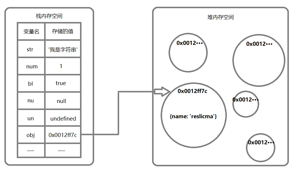 str,num,bl,nu和nu属于基础类型,栈内存就足够了,存储的就是值本身。而obj作为一个引用值(Array),在栈中仅保存一个指针(或地址)