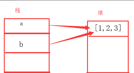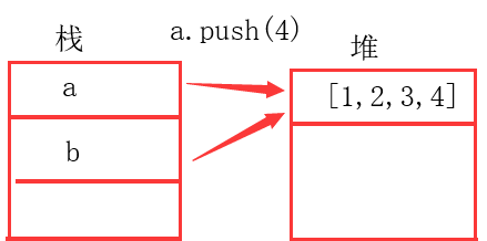 对于引用值来说,a和b的变量名被存入栈中,赋值更像是把a值位置赋给b的指针,所以两个变量都指向a值的地址。因此,即使数组a赋值数组b结束后,再向a中压入4也会影响b的值。