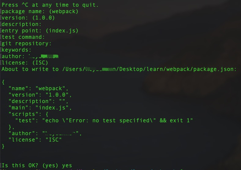 输入这个命令后,终端会问你一系列诸如项目名称,项目描述,作者等信息,也可以使用 npm init -y