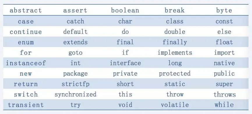 为什么这么说呢?我们拿Java和python出来给大家看看。我们先来看看使用量最多的Java语言。Java的英文单词、学名关键词或者保留字,也就几十个。下面是Java的关键词: