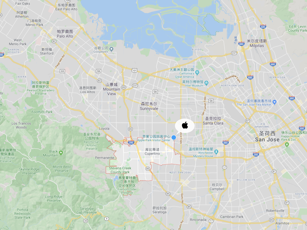 图中蓝点,就是苹果总部的位置,在 Cupertino 的东北角。