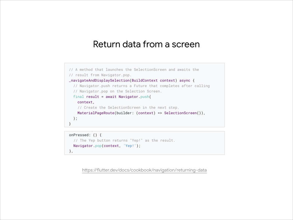 Navigator.push() 异步化(使用 async await 关键字),然后 Navigator.pop() 第 2 个参数传入需带回的数据。
