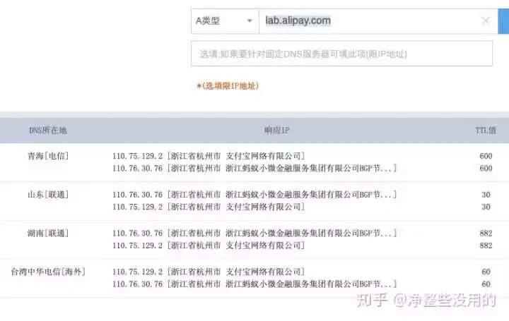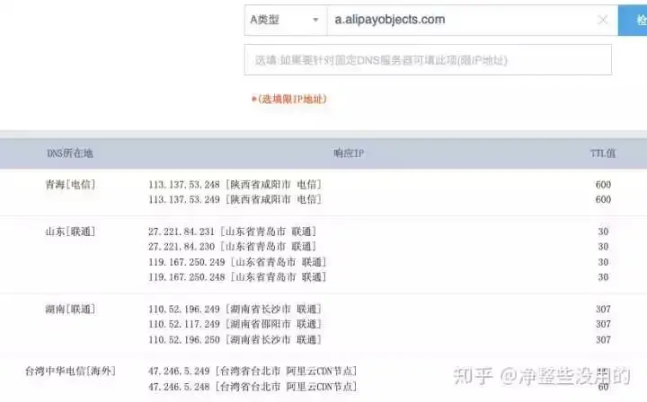 我们可以从侧面大致看一下「http://alipay.com」这个域名的 DNS 指向多少 ip: