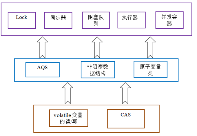 AQS,非阻塞数据结构和原子变量类(java.util.concurrent.atomic包中的类),这些concurrent包中的基础类都是使用这种模式来实现的,而concurrent包中的高层类又是依赖于这些基础类来实现的。从整体来看,concurrent包的实现示意图如下: