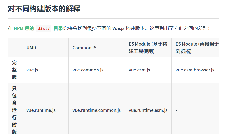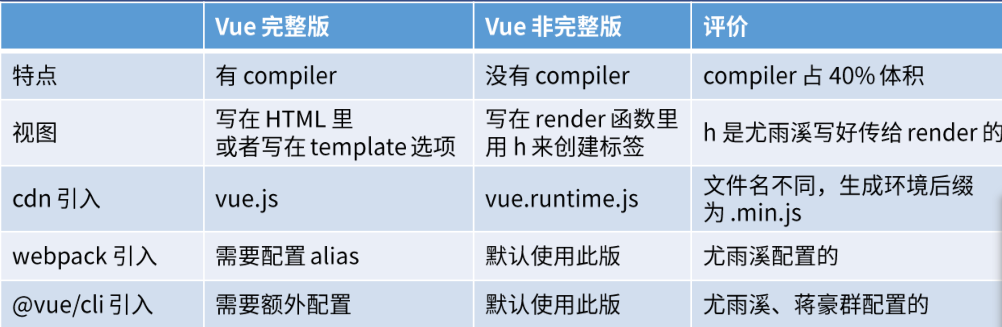 运行时:用来创建 Vue 实例、渲染并处理虚拟 DOM 等的代码。基本上就是除去编译器的其它一切。