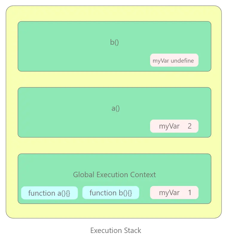 同样是myVar,因为在不同的执行环境中,它们会被存在不同的内存里,所以并不会被覆盖。