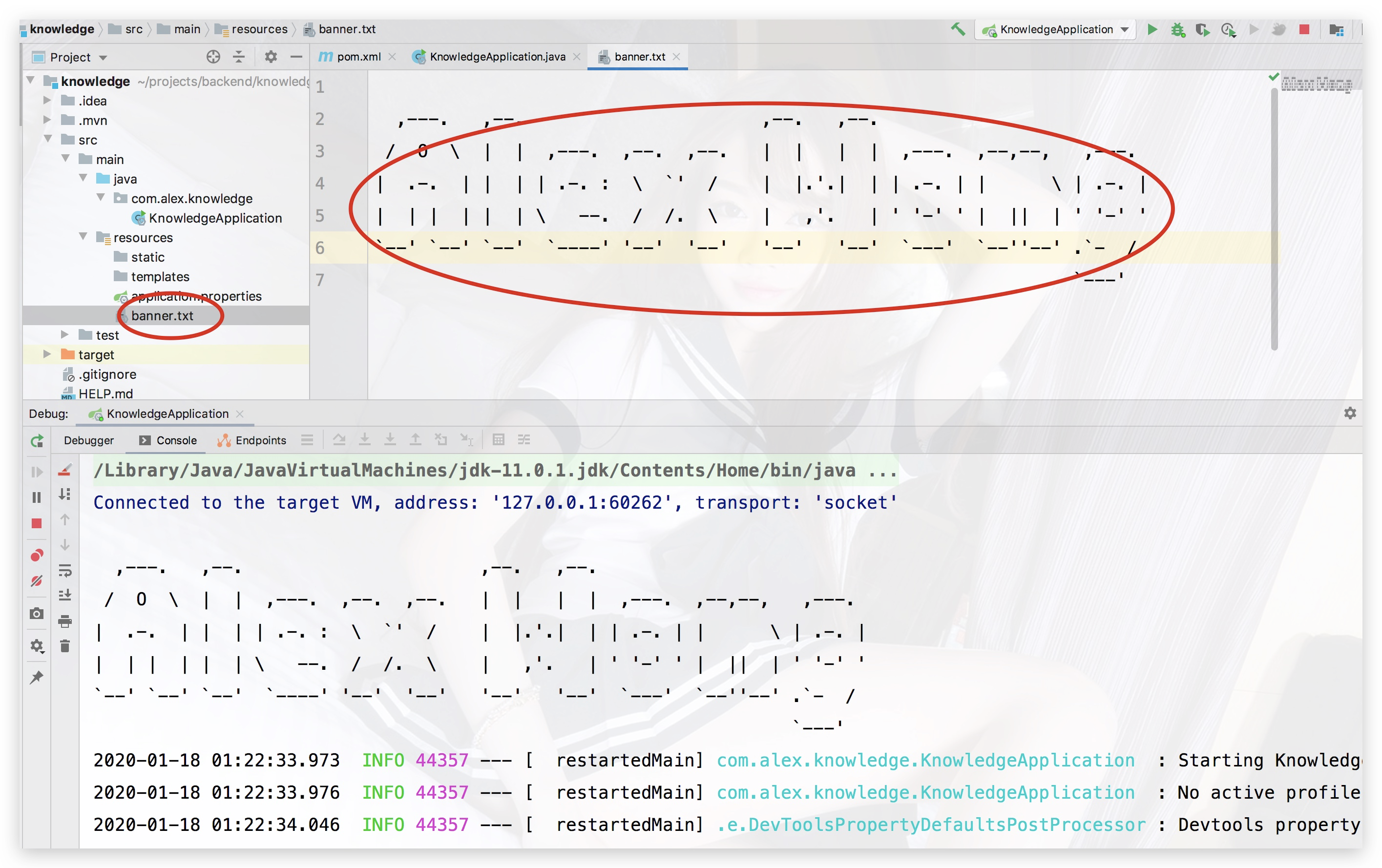 我们只要在 src>resources>banner.txt, 里面输入任何东西都可以在启动程序的时候在控制台看到;