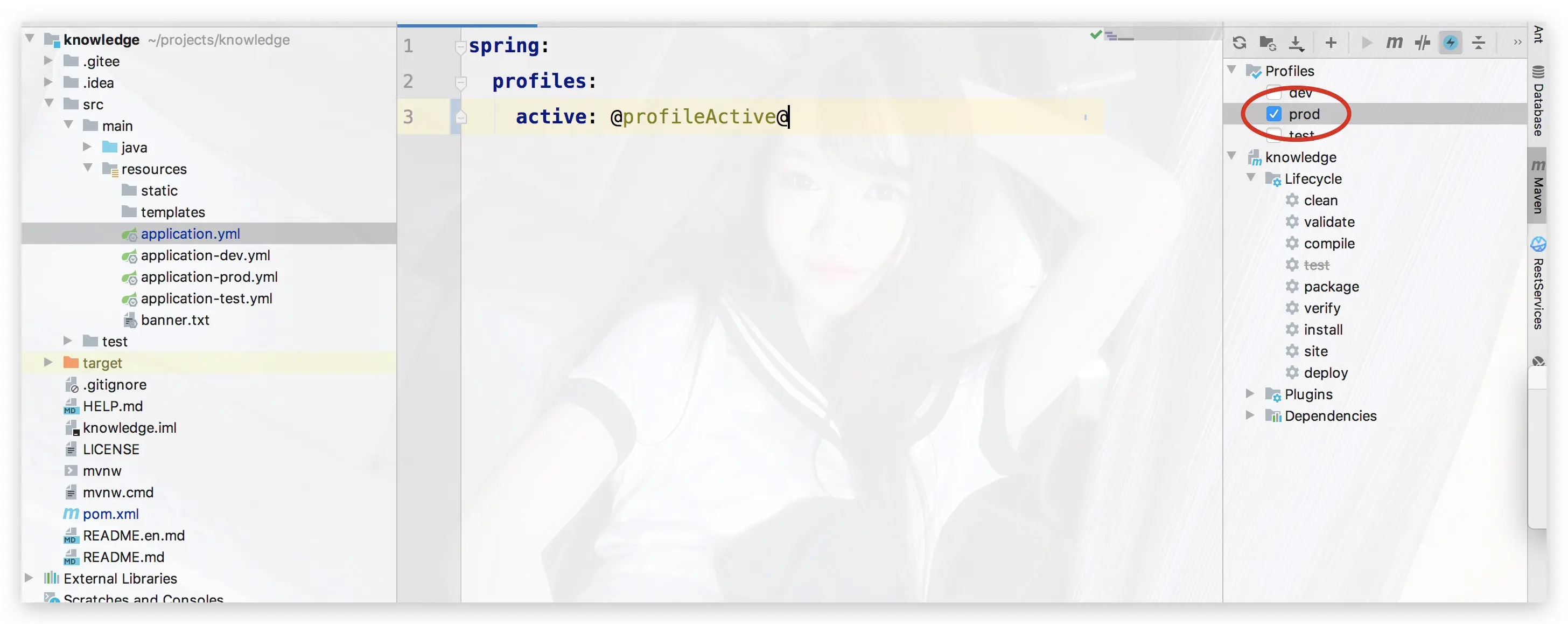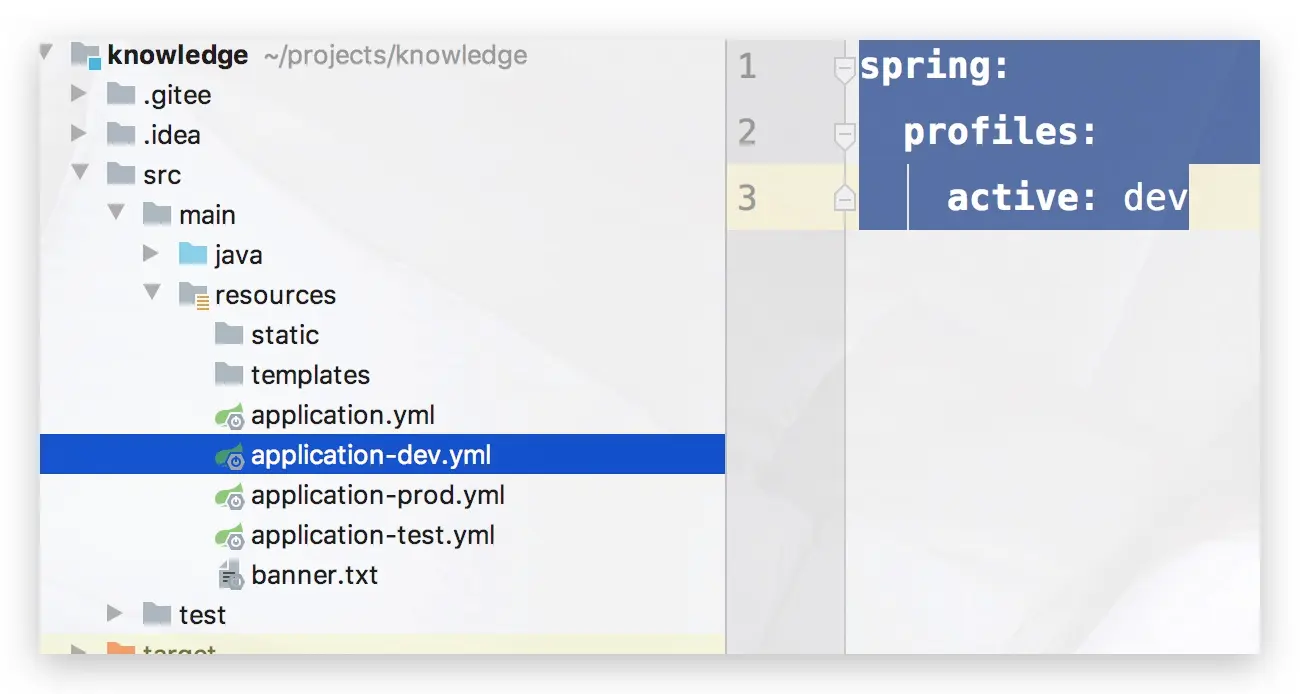 如果我们要激活某一个环境,只需要在 application.yml里: