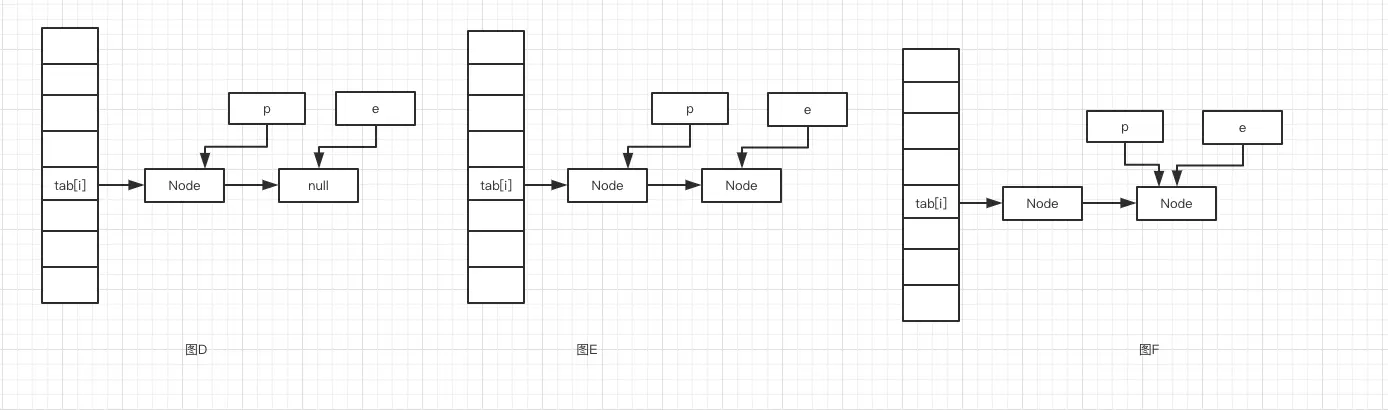 我们假设 tab[i] 进入第二次 hash 冲突,进入到第 17 行代码,此时 p.next 就不为空了,就会进入到第 23 行代码的判断,我们假设不是同一个 key ,这个时候执行第 26 行代码,p 指针指向 e ,如图 C 所示。