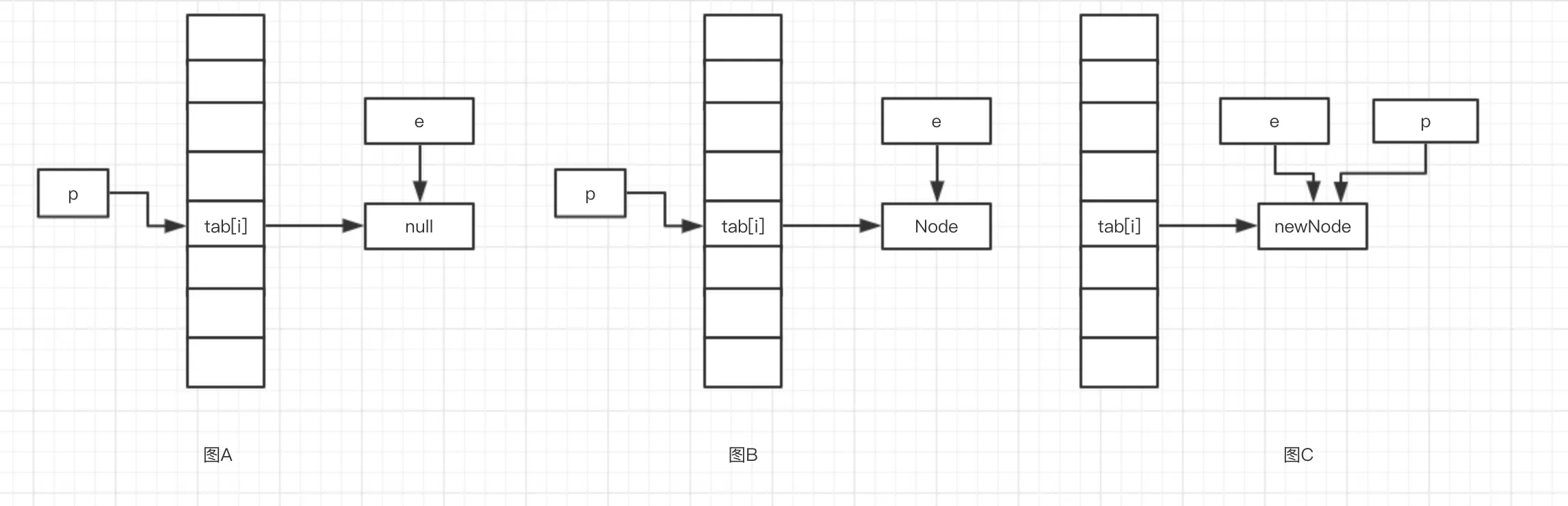 我们假设 tab[i] 进入第三次 hash 冲突,进入到第 17 行代码,我们看看图 C ,这个时候,p.next 又为空了,这个时候就和第一次 hash 冲突类似了。来,上图: