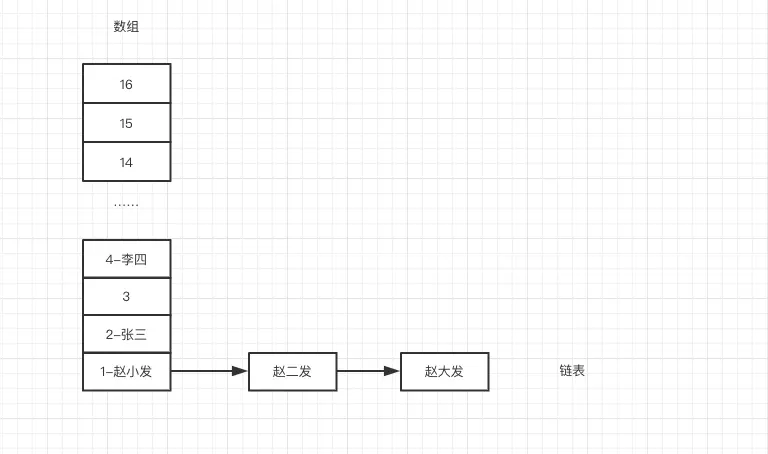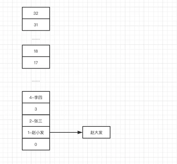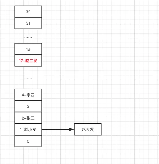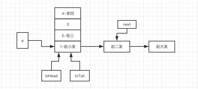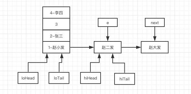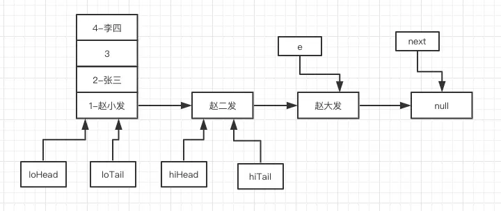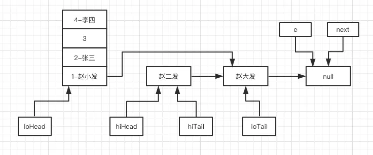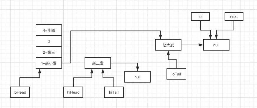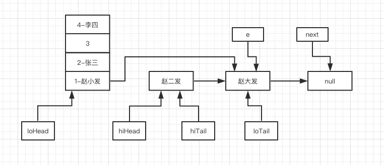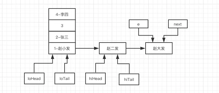 最后我们来看 60 ~ 67 行代码。loTail 此时不为 null ,执行 61、62 行,将 loHead 放在新数组的 index 为 1 的位置上。而此时,“赵小发“的数组后面挂着”赵大发“,新数组就会变成下图所示: