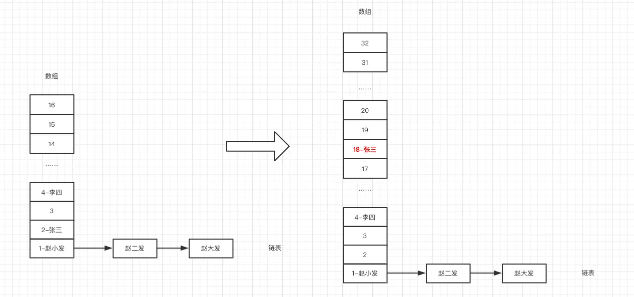 比如“张三”扩容前是通过 张三.hash & (16 - 1) 算出的 index 为 2,那么此时 张三.hash & (32 - 1) 可能算出来就是 18 了,如下图所示: