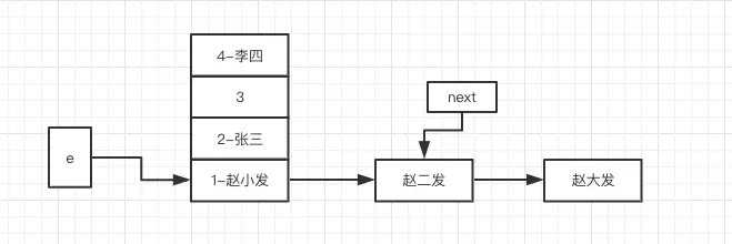 再进入“赵大发”的循环,首先执行 44 行 next = e.next。