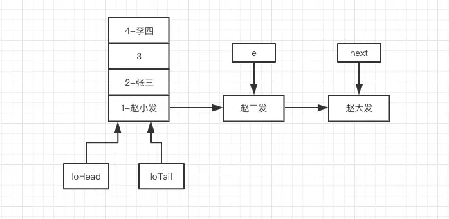 然后千万别忘了,在 59 行 while 循环里面有 e = next,这个时候把 e 指针指向 next ,最终执行完毕之后如下: