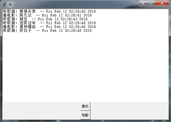 text.insert(tk.END, "看电影:%s \t-- %s\n" %(m, time.ctime()))