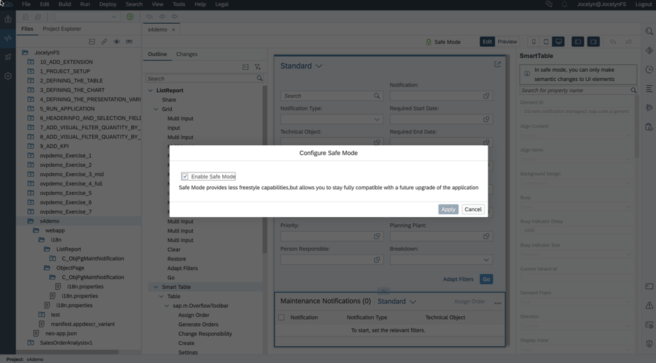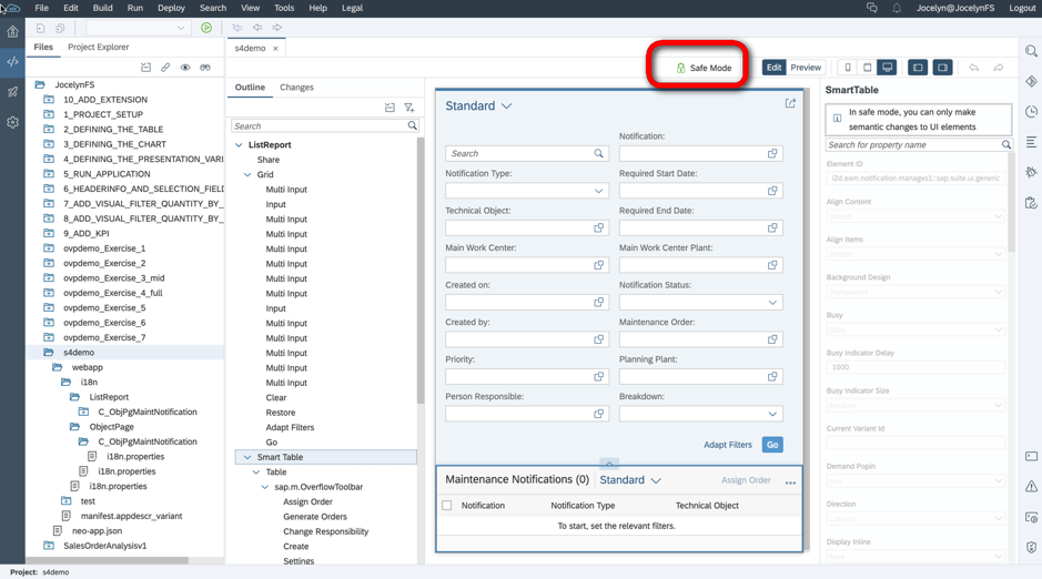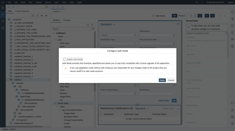 我们注意到这个安全模式的提示,引入这种模式的用意和Android系统以及Windows操作系统的安全模式类似。SAP UI5 Visual Editor的安全模式下,开发者只能针对控件进行受限制的属性修改。