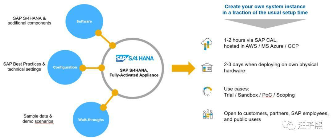该Appliance可以通过**SAP **CAL(Cloud Appliance Library), 在一到两个小时之内部署到AWS, Azure或者Google Cloud Platform上,孵化出可用的S/4HANA系统。当然,On-Premises的孵化方式也仍旧支持,部署到客户本地的物理服务器上,需要花费两到三天。