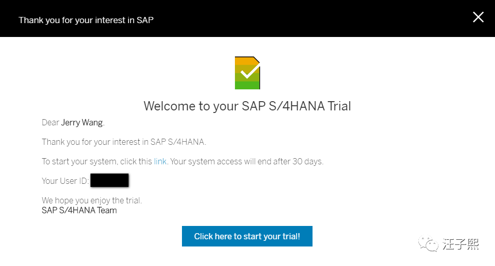 该appliance可以免费试用30天。注册成功后会收到一封邮件,里面包含了能够操作申请的用于测试用途的S/4HANA appliance的CAL url.