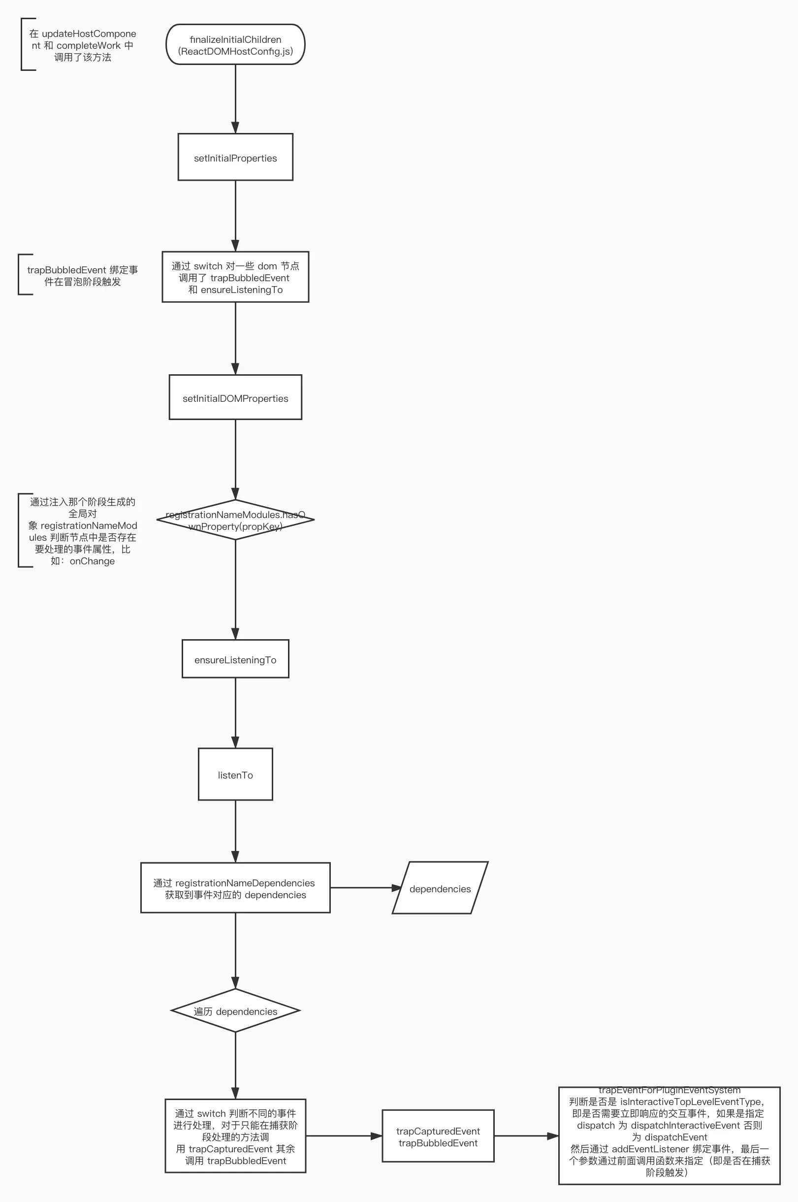 挂载事件的入口方法,在 render 阶段的 completeWork 中被调用,在该方法中会调用 setInitialProperties。