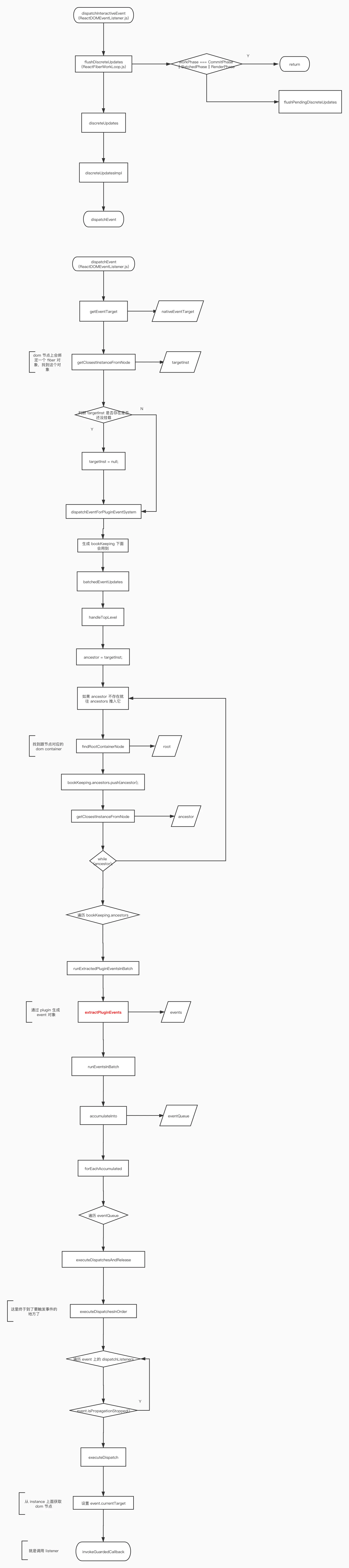 该方法首先通过 getEventTarget 方法获取事件 target 对象(nativeEventTarget),注意 event target 对应的是事件触发的元素而不是事件绑定的元素,接着获取 target 对象对应的 fiber 对象(targetInst),如果自身找不到就向上寻找,如果发现该节点还没有挂载到 dom 上那就把 targetInst 设置为 null,最后调用 dispatchEventForPluginEventSystem 方法。