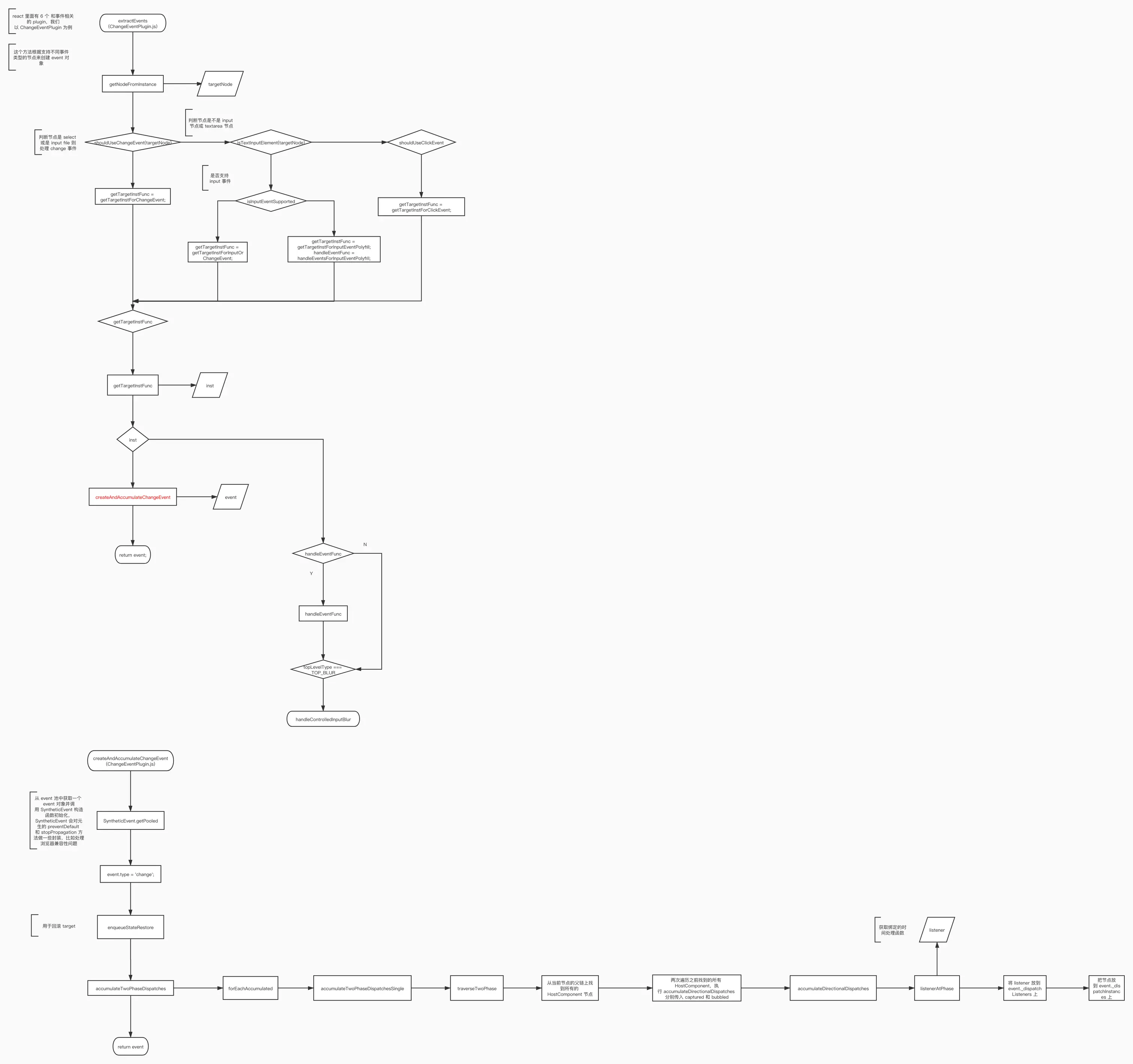 接着我们调用 getTargetInstFunc 这个方法,这个方法内部判断 event 事件是否是对应的事件,比如 getTargetInstForChangeEvent 判断事件名是否是 change,如果是就返回 targetInst(对应的 fiber 对象),然后判断返回的结果是否存在,如果存在就去执行 createAndAccumulateChangeEvent 创建 event 对象并返回,这里这么做事因为所有事件绑定都会去掉每一个 plugin 的 extractEvents 方法,所以需要在内部判断是否需要创建对应类型的 event 对象。
