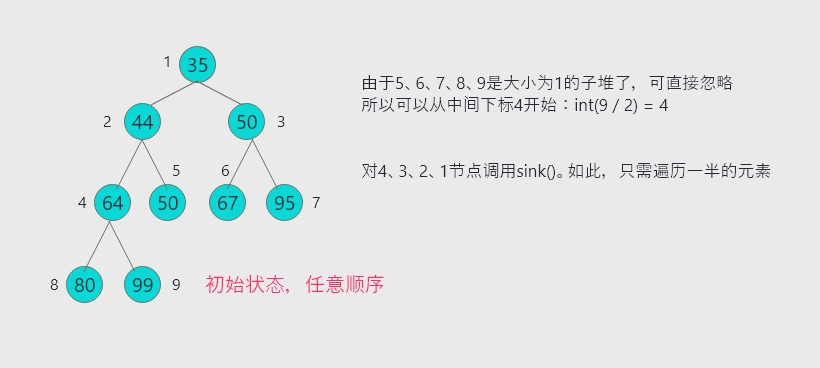 最简单直接的方法就是用swim()方法从左向右遍历元素。但是有一个更加高效的方法:即使用sink()从中间向右构造堆。
