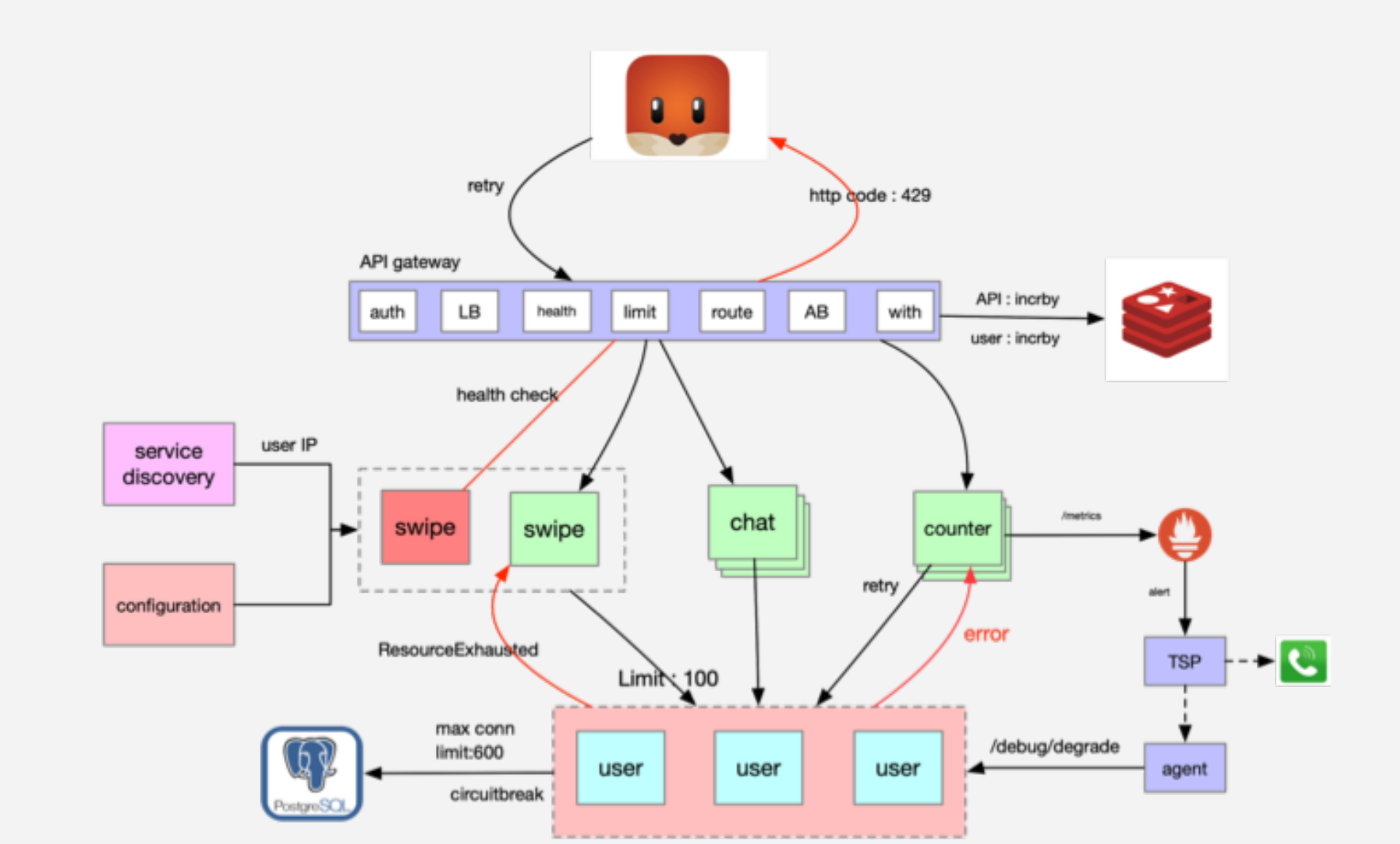 笔者今年参加了一次Gopher大会,有幸听探探的架构师分享了它们今年微服务化的过程,本文快速搭建的IM系统也是使用Go语言来快速实现的,这里先和各位分享一下探探APP的架构图: