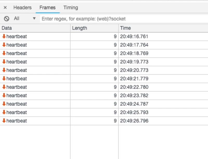 借助go语言很容易搭建协程的特点,我专门开启了一个协程每秒向客户端发送一条消息。打开客户端浏览器可以看到,frame中每秒的心跳数据一直在跳动,当长链接断开之后,心跳就没有了,就像人没有了心跳一样: