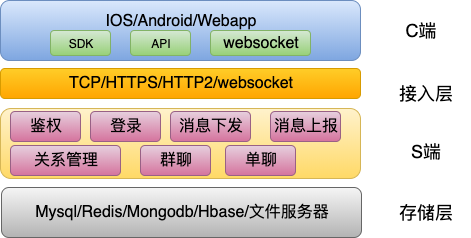 下图是一个比较完备的IM系统架构:包含了C端、接入层(通过协议接入)、S端处理逻辑和分发消息、存储层用来持久化数据。