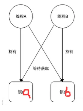 所谓死锁,是指多个进程在运行过程中因争夺资源而造成的一种僵局,当进程处于这种僵持状态时,若无外力作用,它们都将无法再向前推进。 因此我们举个例子来描述,如果此时有一个线程A,按照先锁a再获得锁b的的顺序获得锁,而在此同时又有另外一个线程B,按照先锁b再锁a的顺序获得锁。如下图所示: