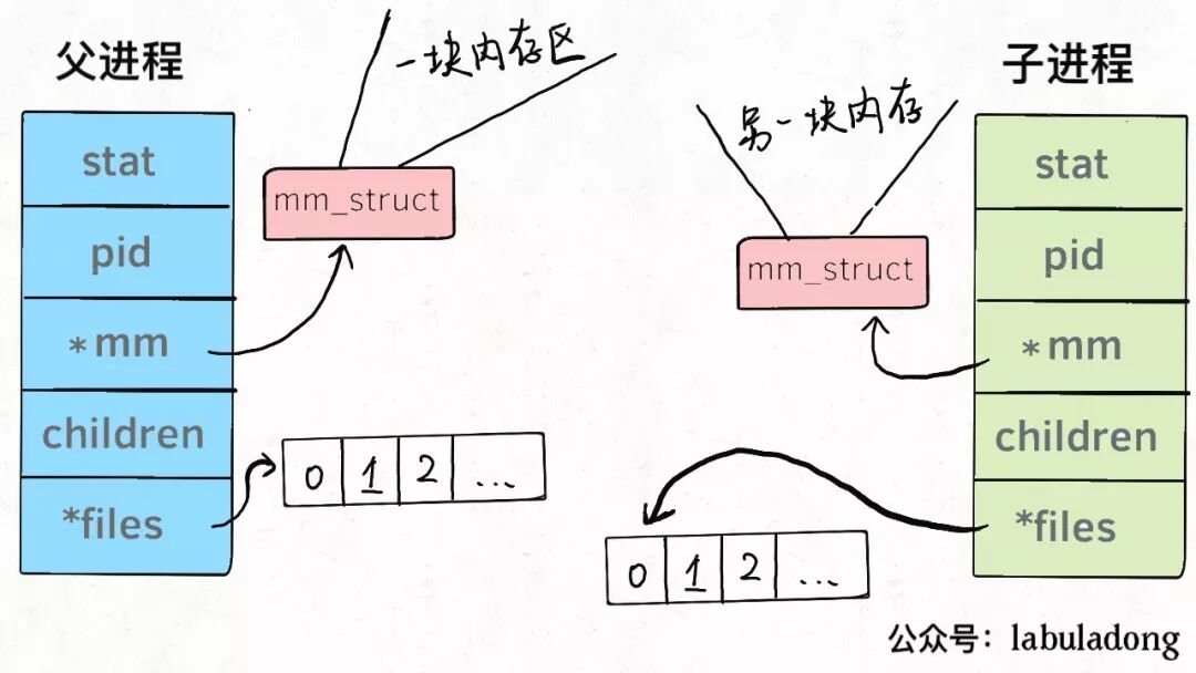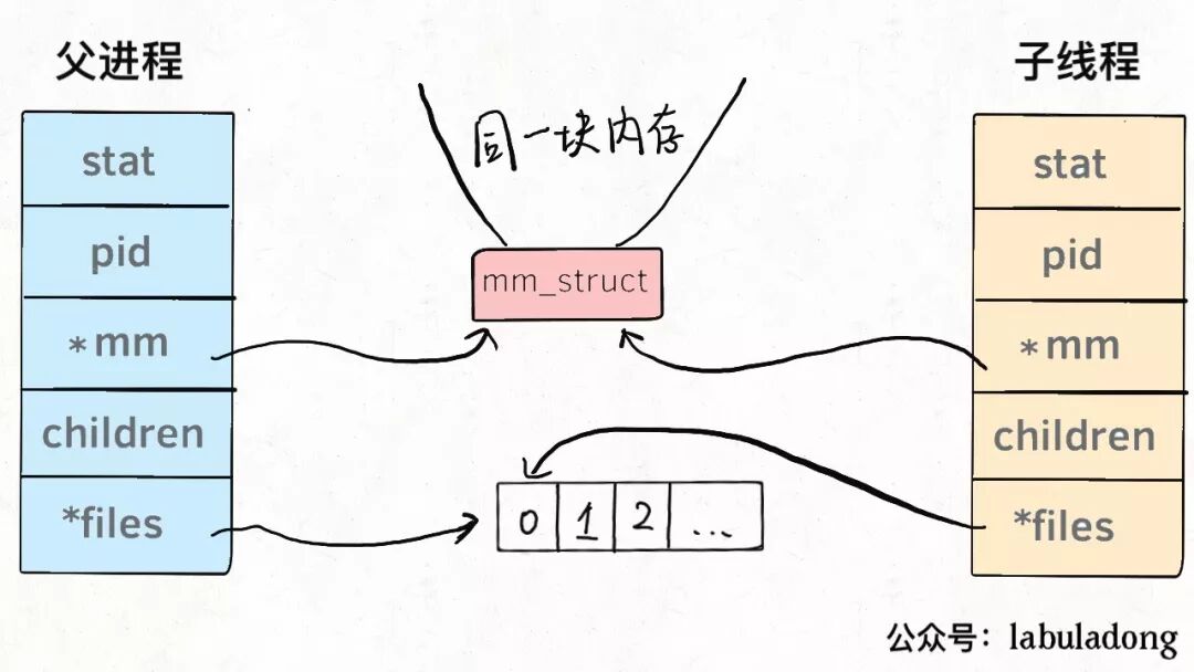 换句话说,线程看起来跟进程没有区别,只是线程的某些数据区域和其父进程是共享的,而子进程是拷贝副本,而不是共享。就比如说,mm结构和 files结构在线程中都是共享的,我画两张图你就明白了: