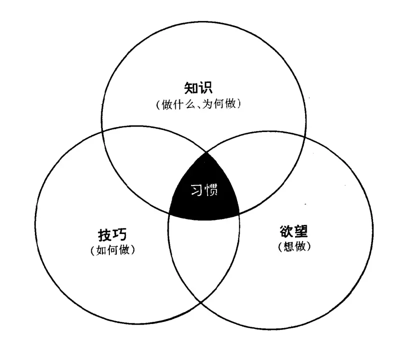 本书将习惯定义为“知识"、“技巧”与“欲望”三者的混合体。知识是理论性的观念,指点我们“做什么”及“为何做”。技巧是指“如何做”。欲望则是“想做”,表示我们有付诸行动的愿望。要培养一种习惯,这三项要素缺一不可。