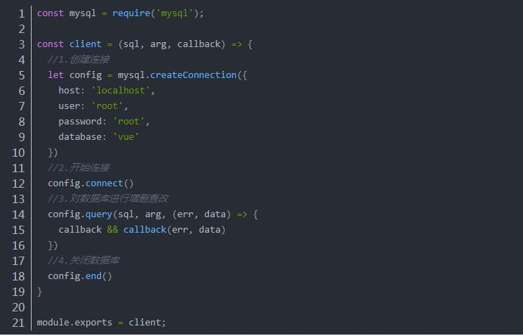 node连接mysql 简单说事 2020-01-18 222 阅读1分钟 摘自: https://blog.csdn.net/fed_guanqi/article/details/90763667node连接mysql下载mysql依赖安装一下依赖包。npm i -D mysql npm i -D node-mysql引入配置包在根目录下的model/db.js文件中引入包。具体使用方法这里以一个注册登录为例展示使用方法。