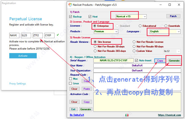 Requese Code值复制到注册机Request Code中,点击Generate生成激活码,将激活码复制到Navicat Premium 15.0.3中的Activation Code中激活