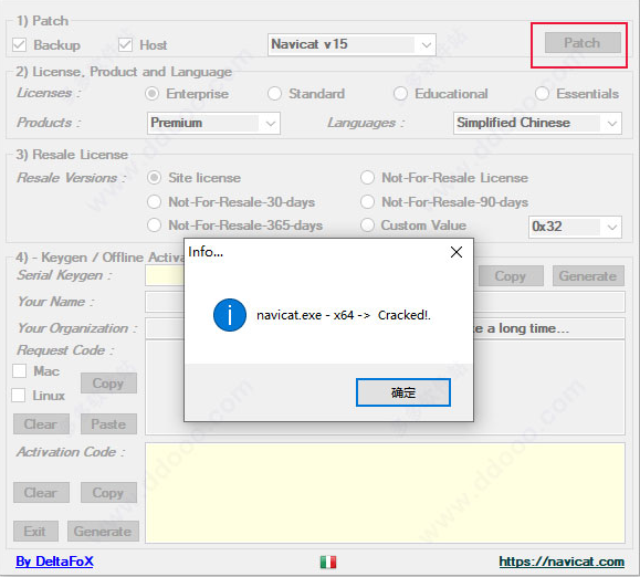 运行注册机,选择 navicat v15, enterprise,Premium 后,点击 patch 按纽,选择 Navicat Premium 安装目录
