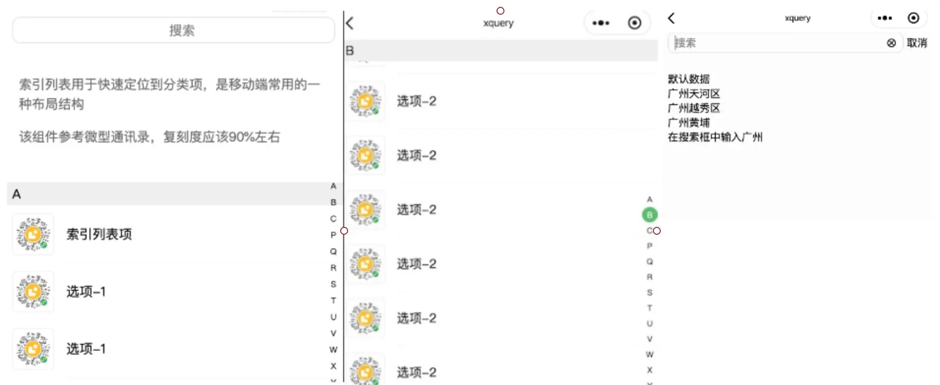 最近调整公司小程序业务的核心日历组件,费了不少时间,不过也优化了一把xquery的核心代码,抽空一周左右的时间仿了两个微信最常见的组件,一个索引列表组件、一个自定义tabbar组件,想到后期业务上这两个组件的几率还是蛮大的,并不容易,考虑的点也挺多的 demo如下图所示
