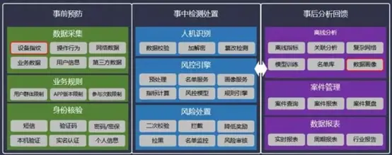 全链路风控解决方案,包括三大部分:事前预防、事中检测处置、事后分析回馈