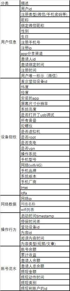 用户信息/ 设备指纹 / 操作行为 / 网络数据 / 提现数据 /第三方数据